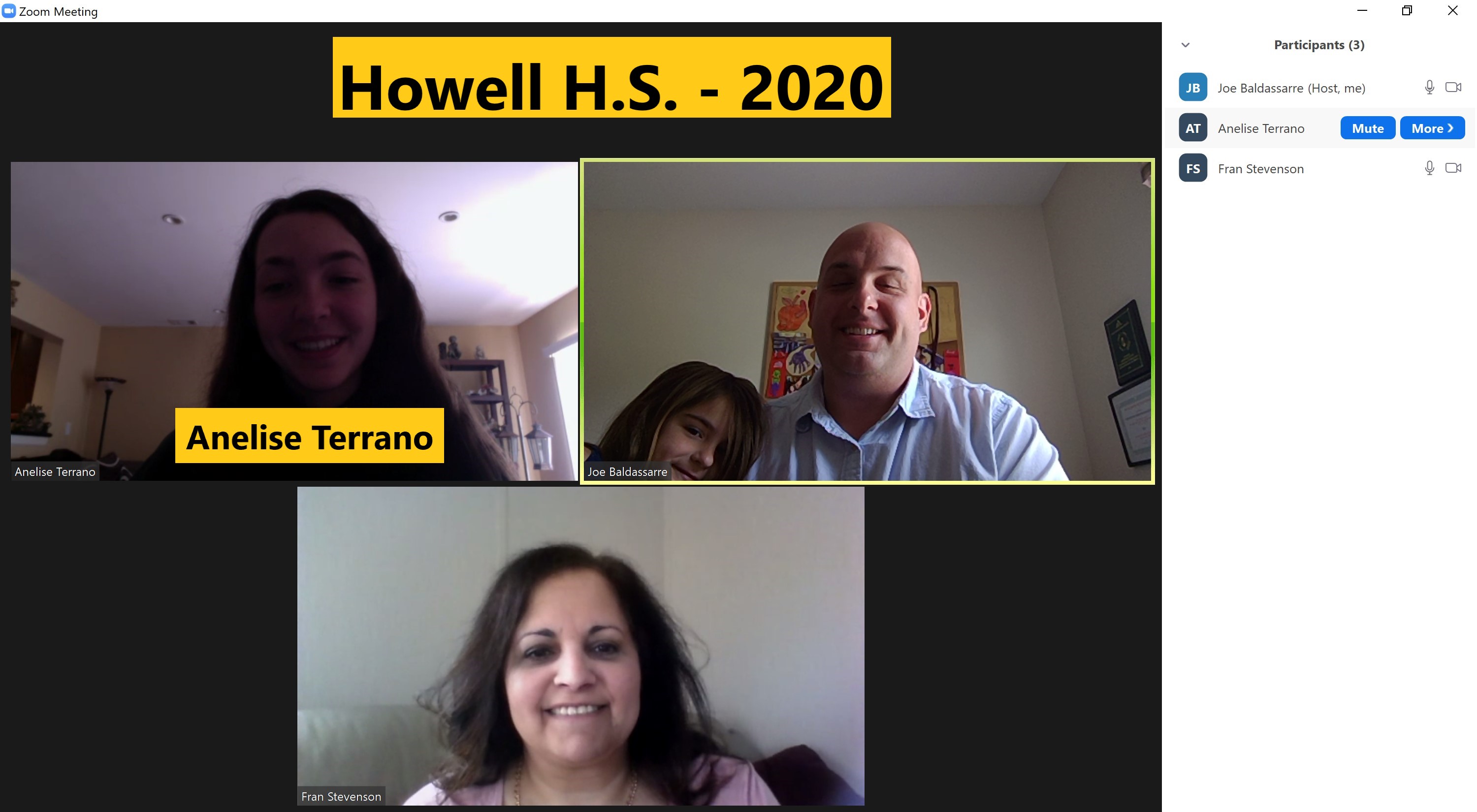 Congratulations to the next recipient of a JBF 2020 scholarship, Anelise Terrano of Howell H.S! This is the third year that JBF has given a scholarship at Howell. With the school guidance counselor, Ms. Stevenson, and Rossella and Giada in the background, over Zoom, Anelise was commended for tremendous academic success. Anelise will be attending Wagner College in the fall for nursing. She will also be a part of Wagner's inaugural bowling team.